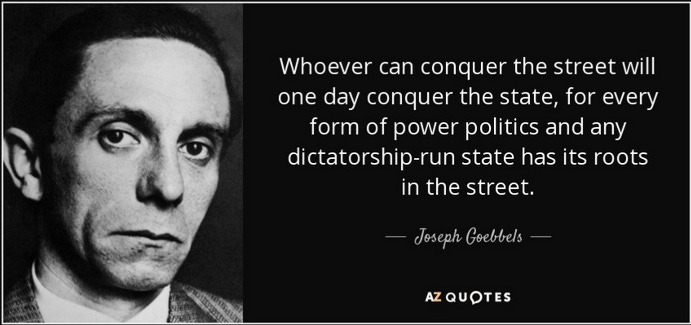 The Dems studied Goebbels’ propaganda techniques. They are invading public spaces and controlling them. The moron voter who wants to be part of the “in” crowd will go along like a sheep in order to be accepted.