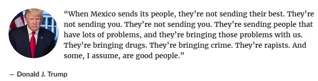 Now, Trump has Narcissistic Personality Disorder (NPD). As with Obama, it gives him a certain charisma. Just look at how Trump renamed the Kennedy center as the Trump-Kennedy center. I was against it till I saw the meltdown on the left over it. Politicians with NPD will find an issue, get out in front the furthest on the issue, and when the crowd cheers for the issue, the narcissist internalizes it as the crowd cheering for he himself. Trump’s elevator speech is an example of this. Senator Ted Cruz had said some things against illegal immigration and Trump sought to outdo him.